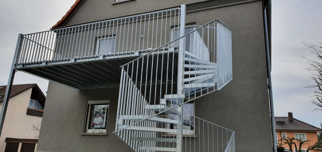 Der Anbaubalkon ist einseitig abgestützt. Eine der beiden Stützen dient gleichzeitig als Mittelteil der anschließenden Wendeltreppe. Die Besonderheiten der Wendeltreppe sind ihre eckige Form und die handgefertigten Treppenstufen.
