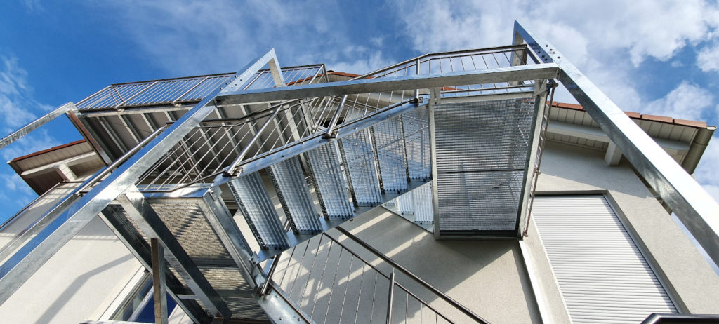 Die Treppen- sowie Balkonunterkonstruktion sind in feuerverzinkter Ausführung. Das Geländer mit senkrecht angeordneten Rundstäben ist in Edelstahl ausgeführt.